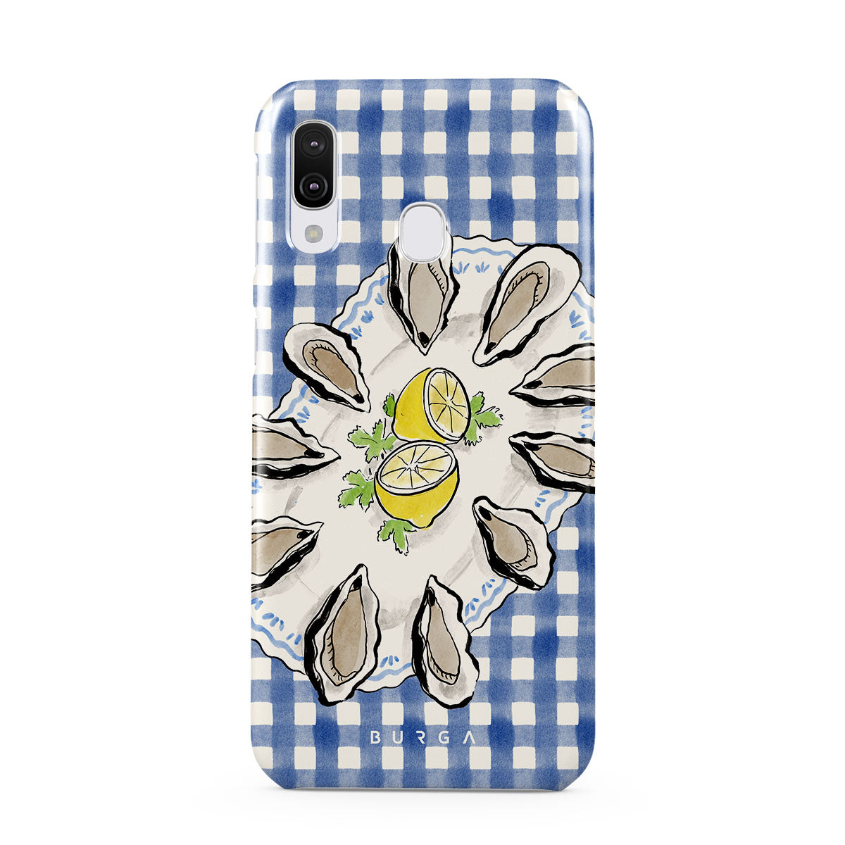 Questo design include: Ostriche, limone, gingham blu, elementi costieri freschi, toni pastello morbidi.