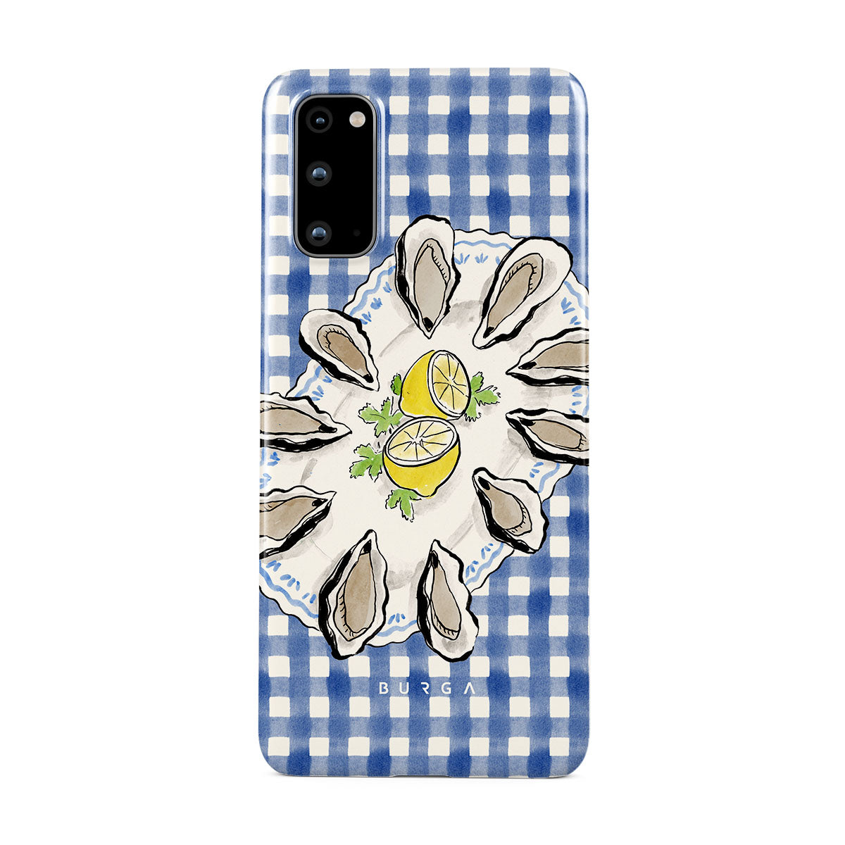 Questo design include: Ostriche, limone, gingham blu, elementi costieri freschi, toni pastello morbidi.