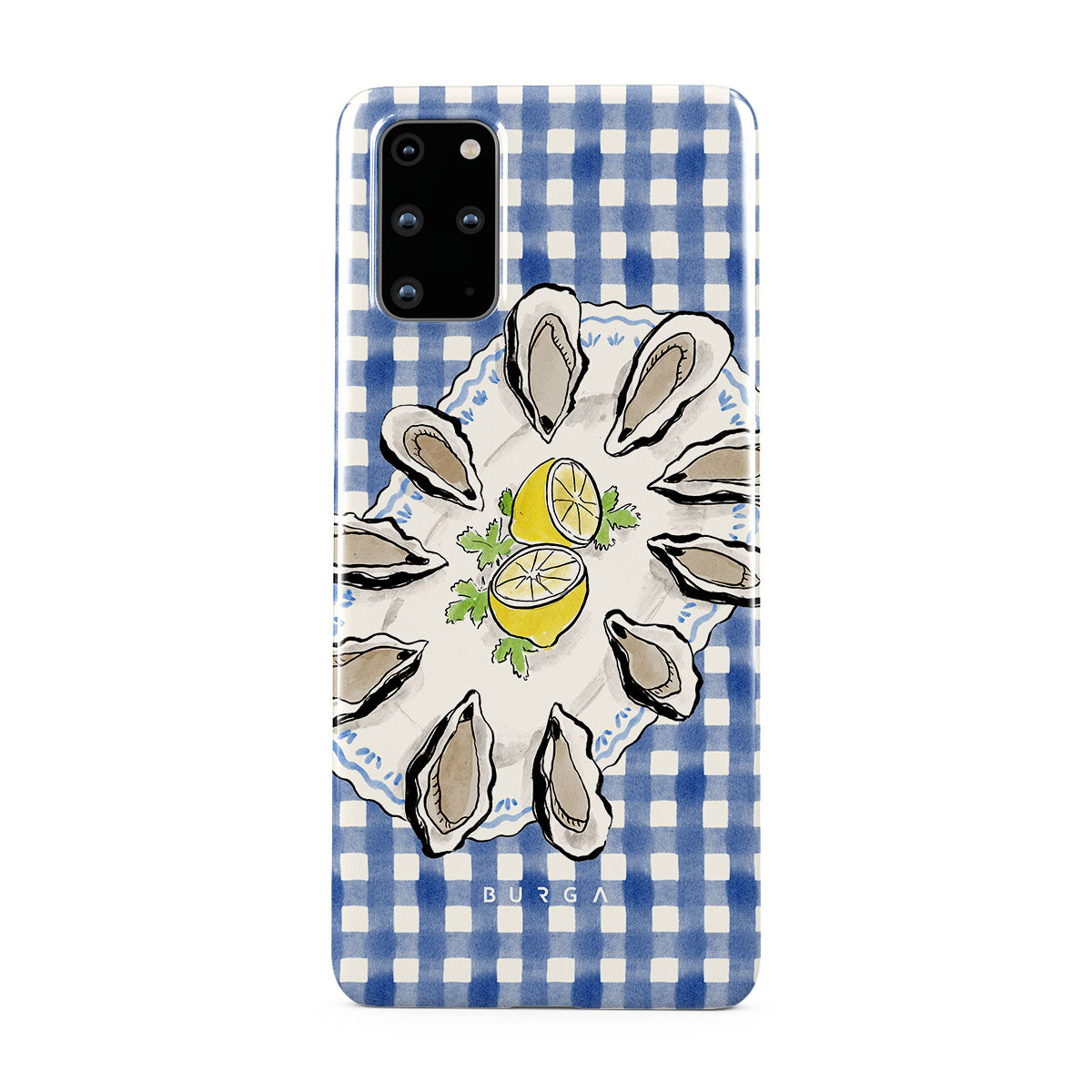 Questo design include: Ostriche, limone, gingham blu, elementi costieri freschi, toni pastello morbidi.
