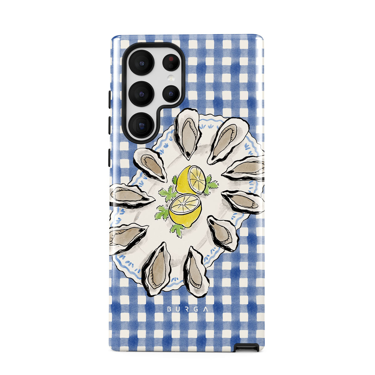 Questo design include: Ostriche, limone, gingham blu, elementi costieri freschi, toni pastello morbidi.