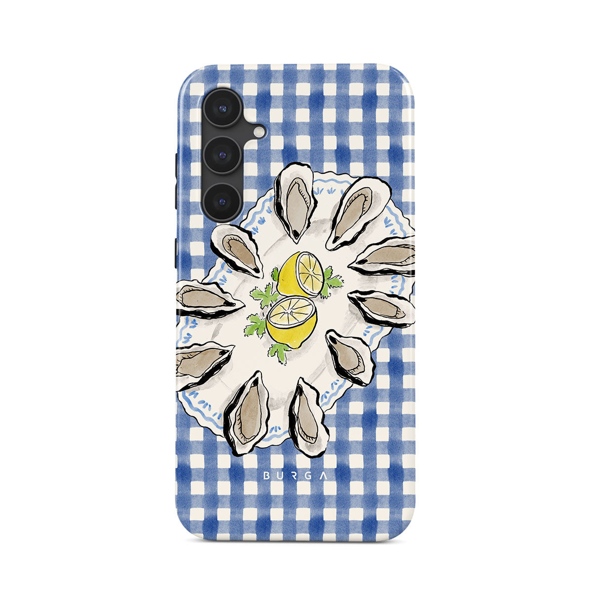 Questo design include: Ostriche, limone, gingham blu, elementi costieri freschi, toni pastello morbidi.