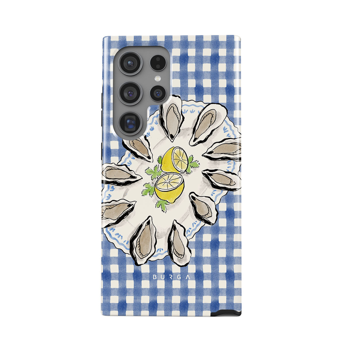 Questo design include: Ostriche, limone, gingham blu, elementi costieri freschi, toni pastello morbidi.