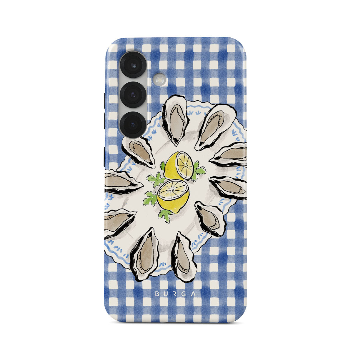 Questo design include: Ostriche, limone, gingham blu, elementi costieri freschi, toni pastello morbidi.