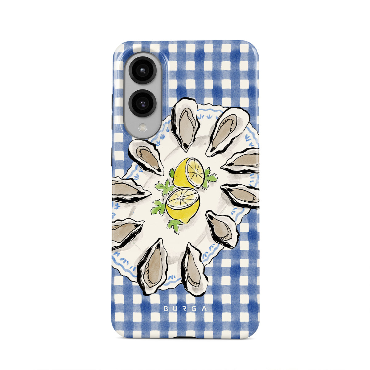 Questo design include: Ostriche, limone, gingham blu, elementi costieri freschi, toni pastello morbidi.