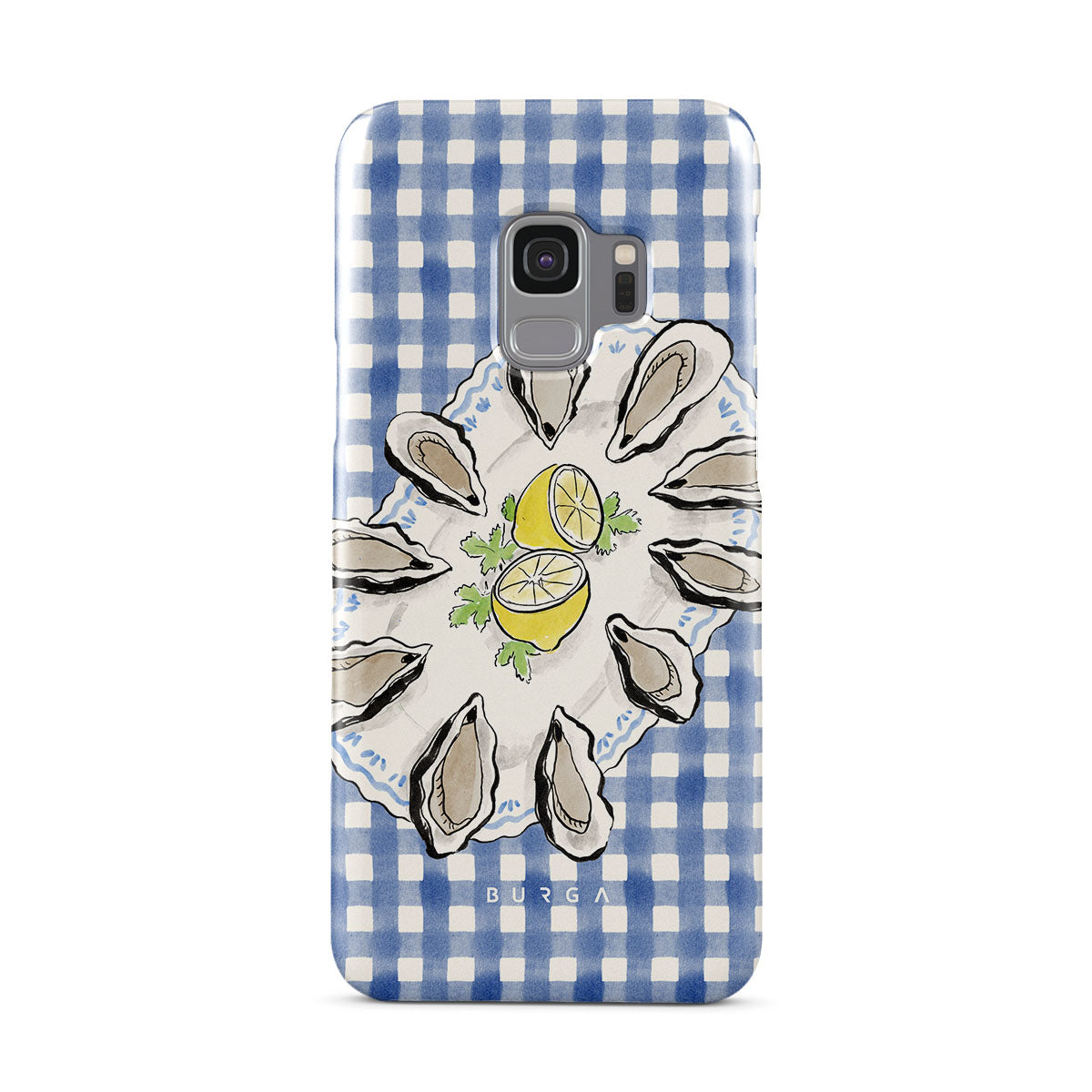 Questo design include: Ostriche, limone, gingham blu, elementi costieri freschi, toni pastello morbidi.