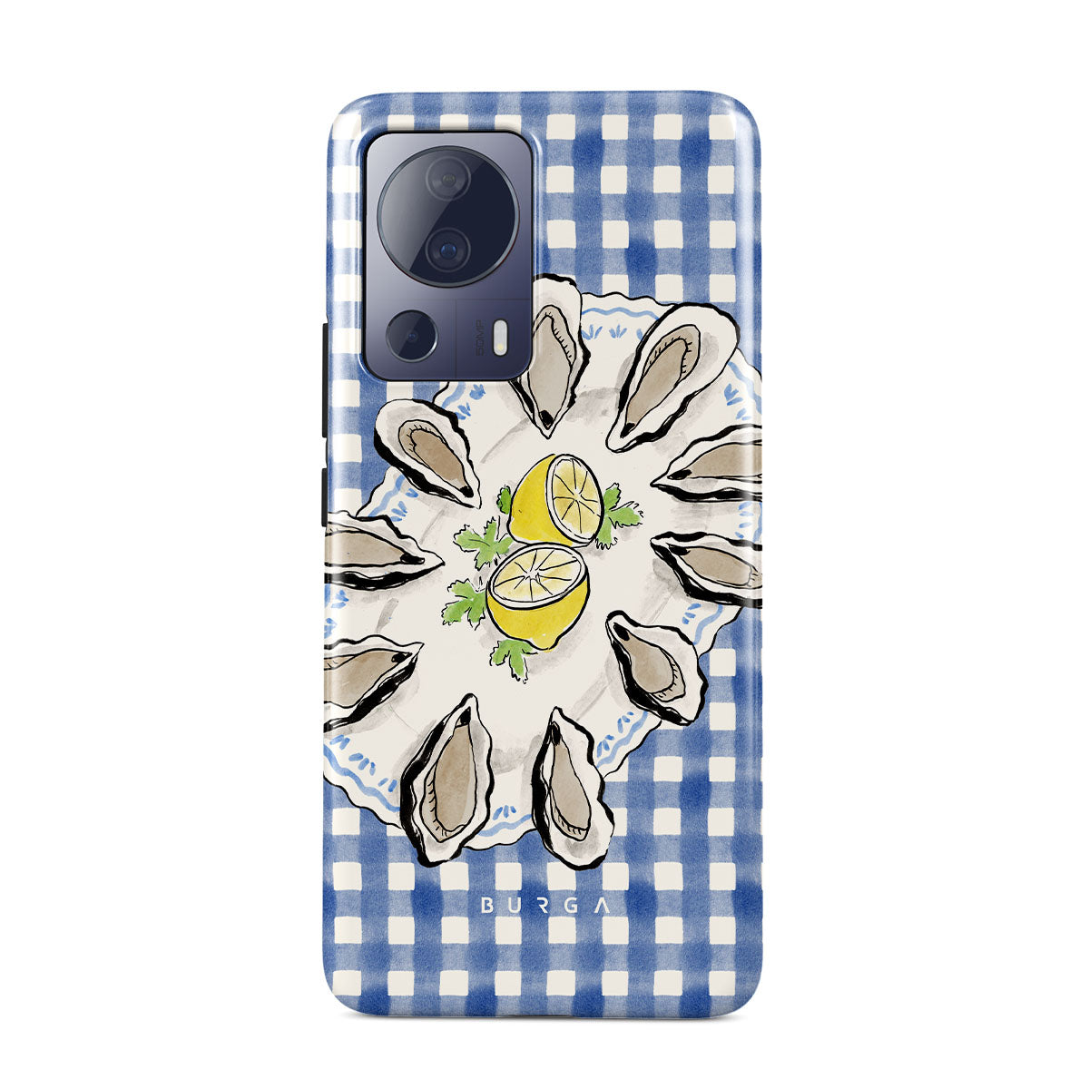 Questo design include: Ostriche, limone, gingham blu, elementi costieri freschi, toni pastello morbidi.