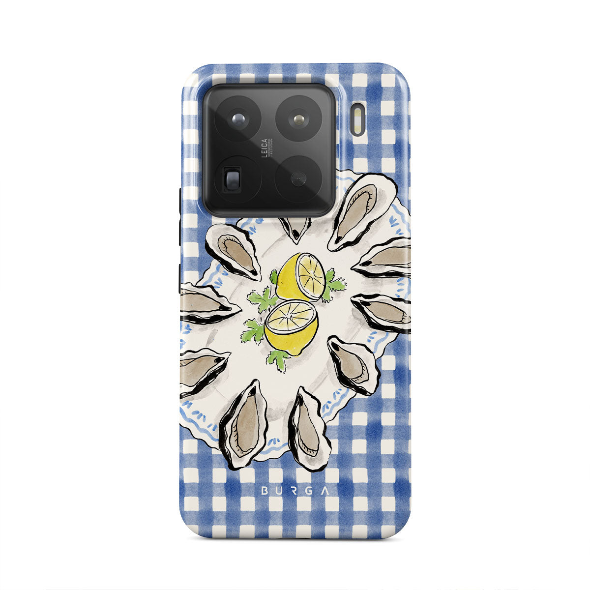 Questo design include: Ostriche, limone, gingham blu, elementi costieri freschi, toni pastello morbidi.