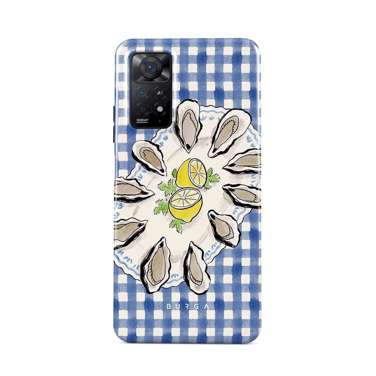 Questo design include: Ostriche, limone, gingham blu, elementi costieri freschi, toni pastello morbidi.