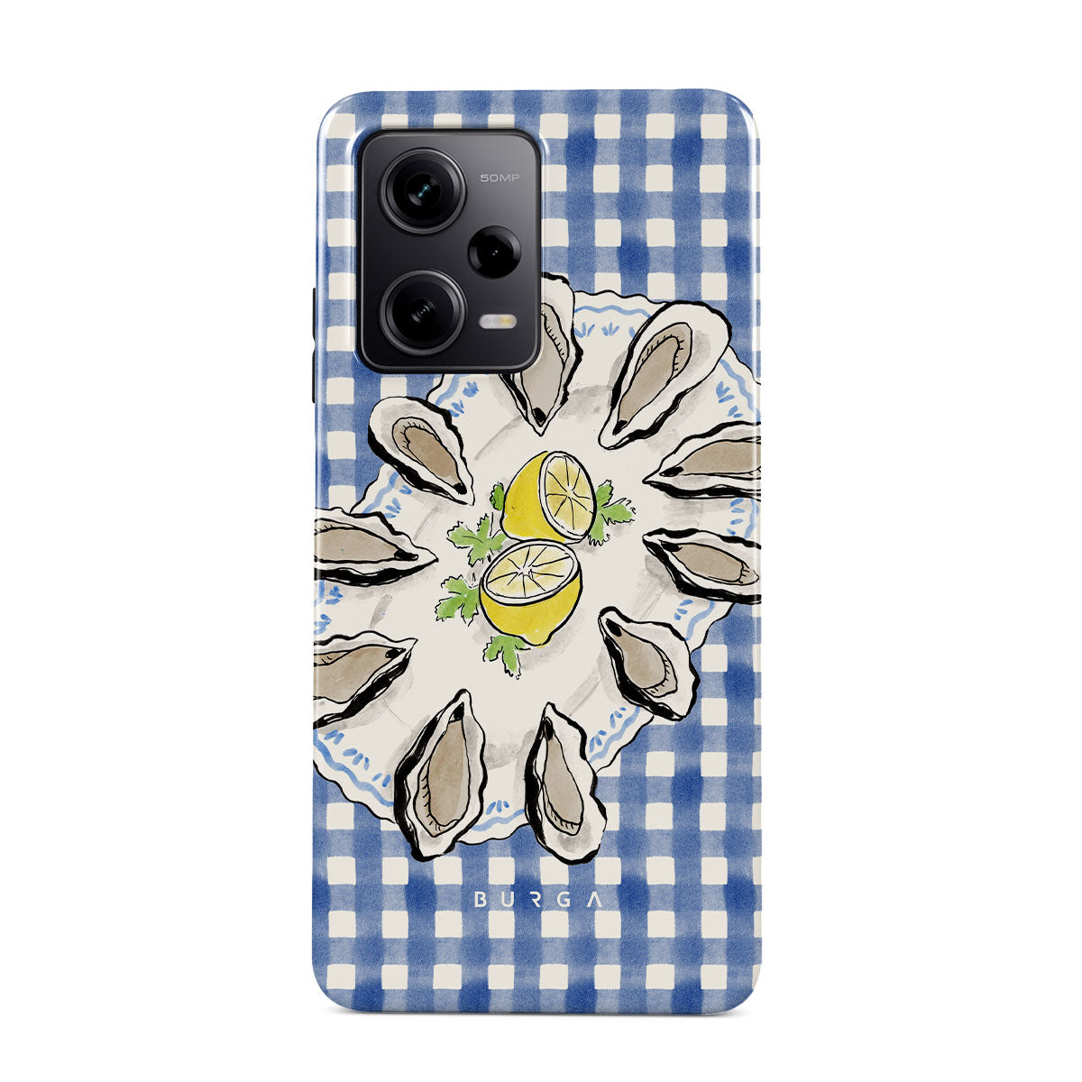 Questo design include: Ostriche, limone, gingham blu, elementi costieri freschi, toni pastello morbidi.