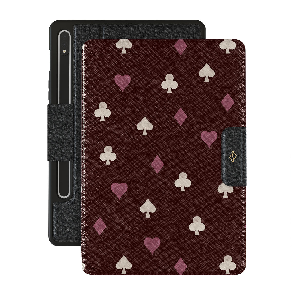 Questo design include: semi delle carte, cuori, picche, quadri, fiori, sfondo bordeaux