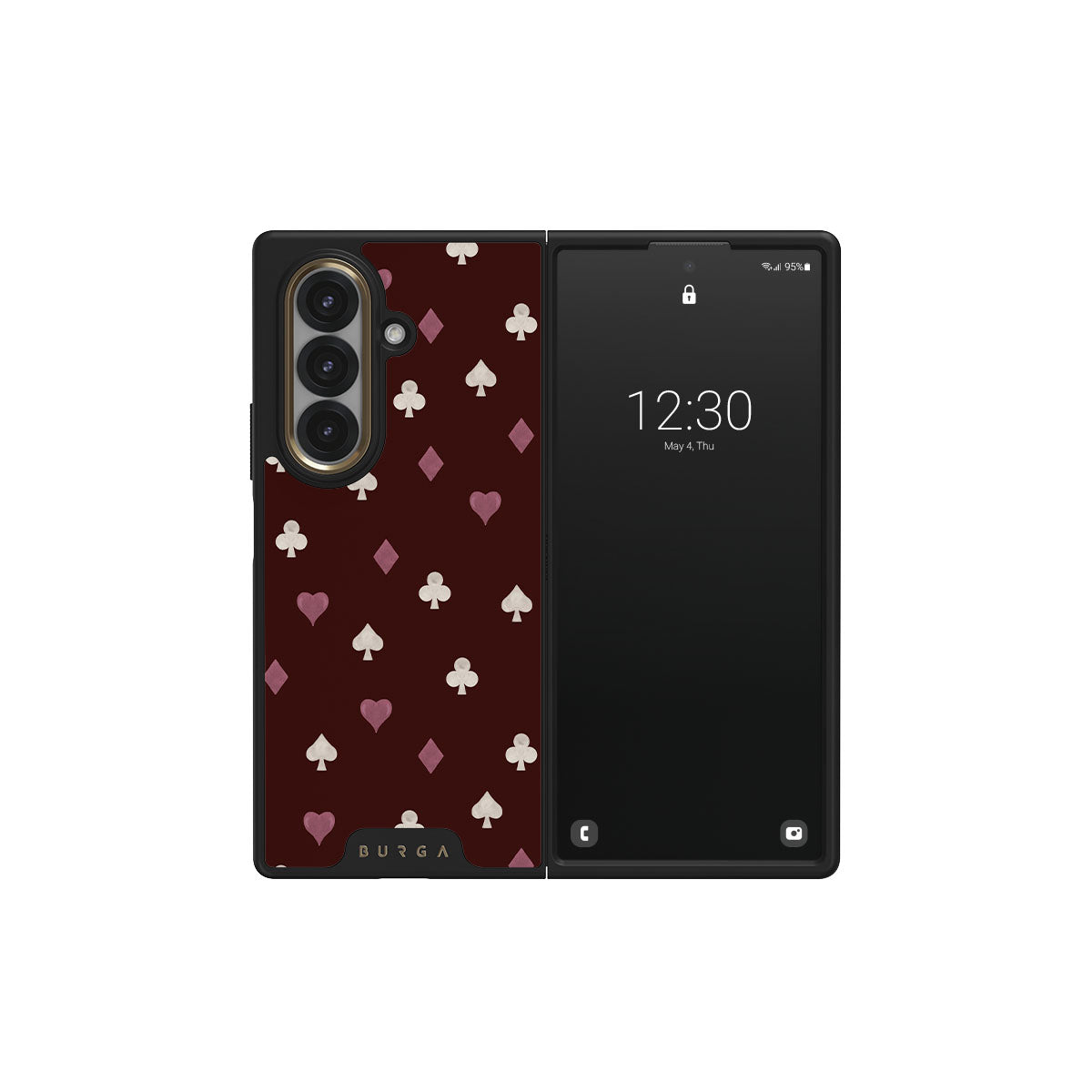 Questo design include: semi delle carte, cuori, picche, quadri, fiori, sfondo bordeaux