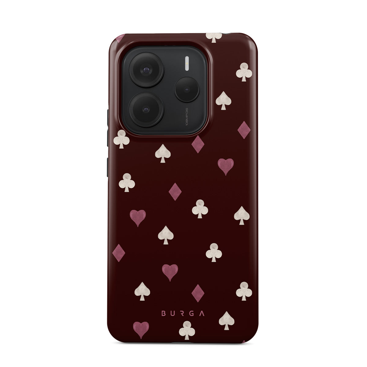 Questo design include: semi delle carte, cuori, picche, quadri, fiori, sfondo bordeaux