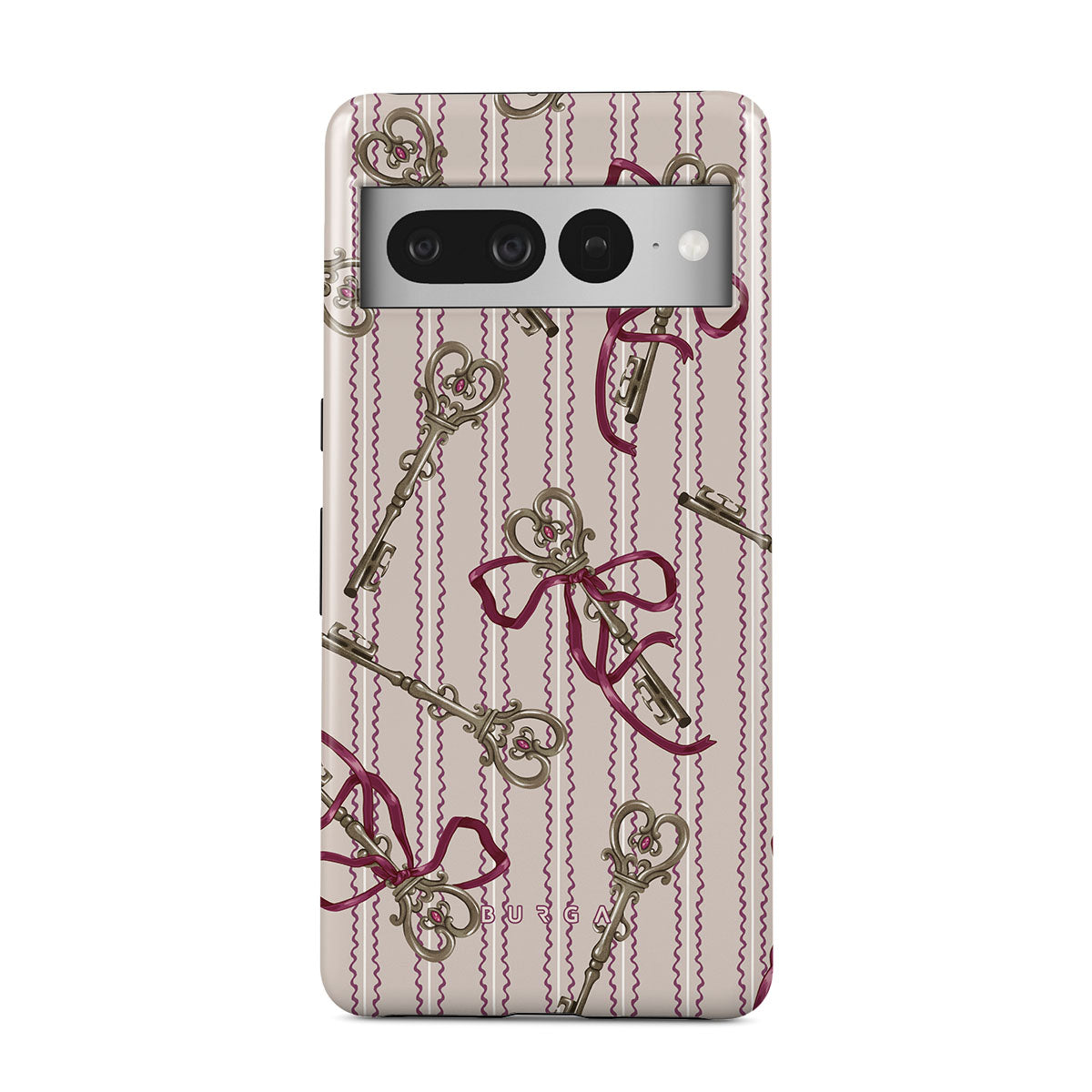 Questo design include: chiavi antiche, fiocchi, nastri rosa, sfondo a righe