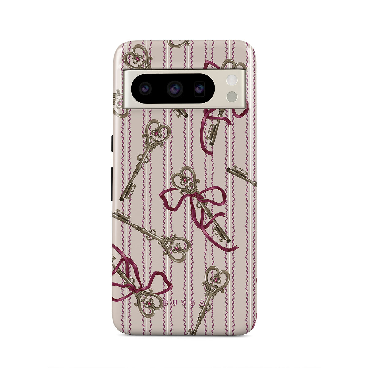 Questo design include: chiavi antiche, fiocchi, nastri rosa, sfondo a righe