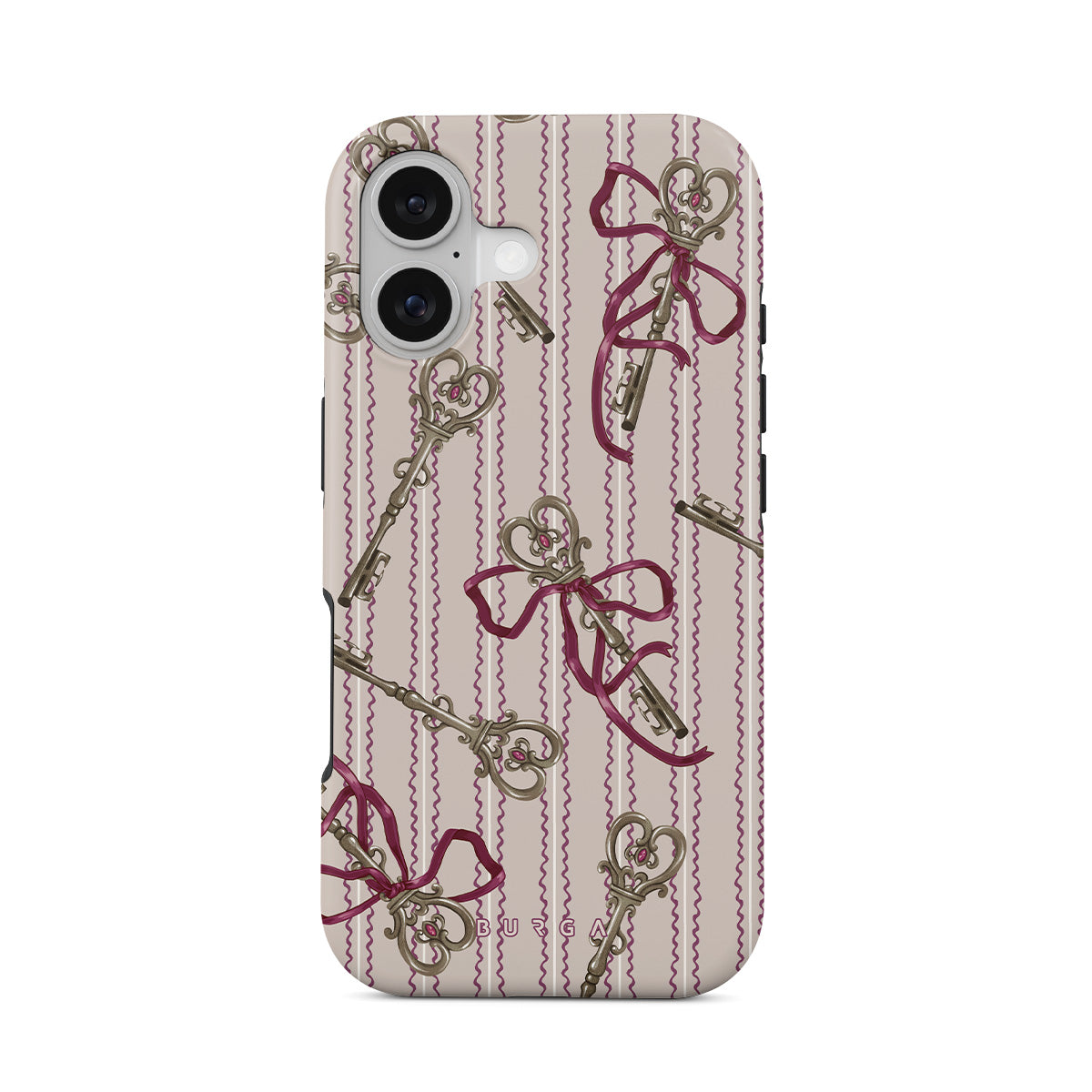 Questo design include: chiavi antiche, fiocchi, nastri rosa, sfondo a righe
