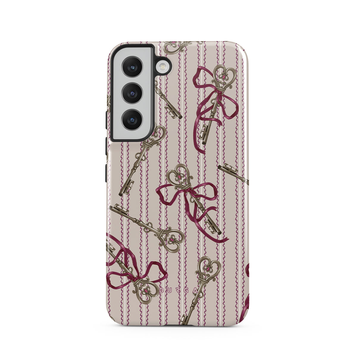 Questo design include: chiavi antiche, fiocchi, nastri rosa, sfondo a righe