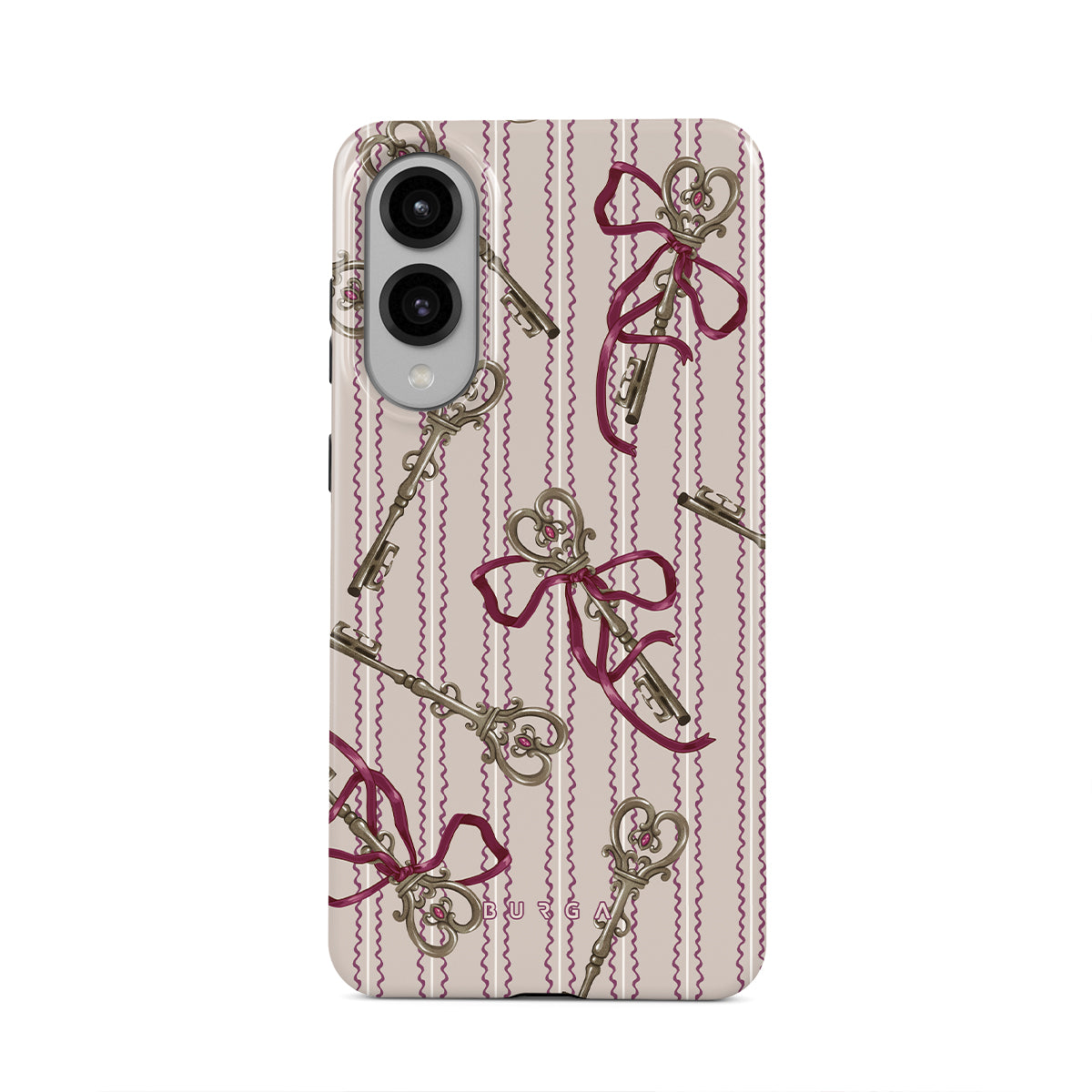 Questo design include: chiavi antiche, fiocchi, nastri rosa, sfondo a righe