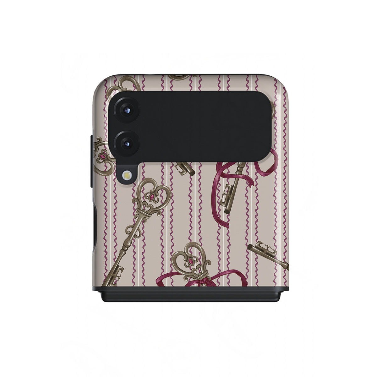 Questo design include: chiavi antiche, fiocchi, nastri rosa, sfondo a righe