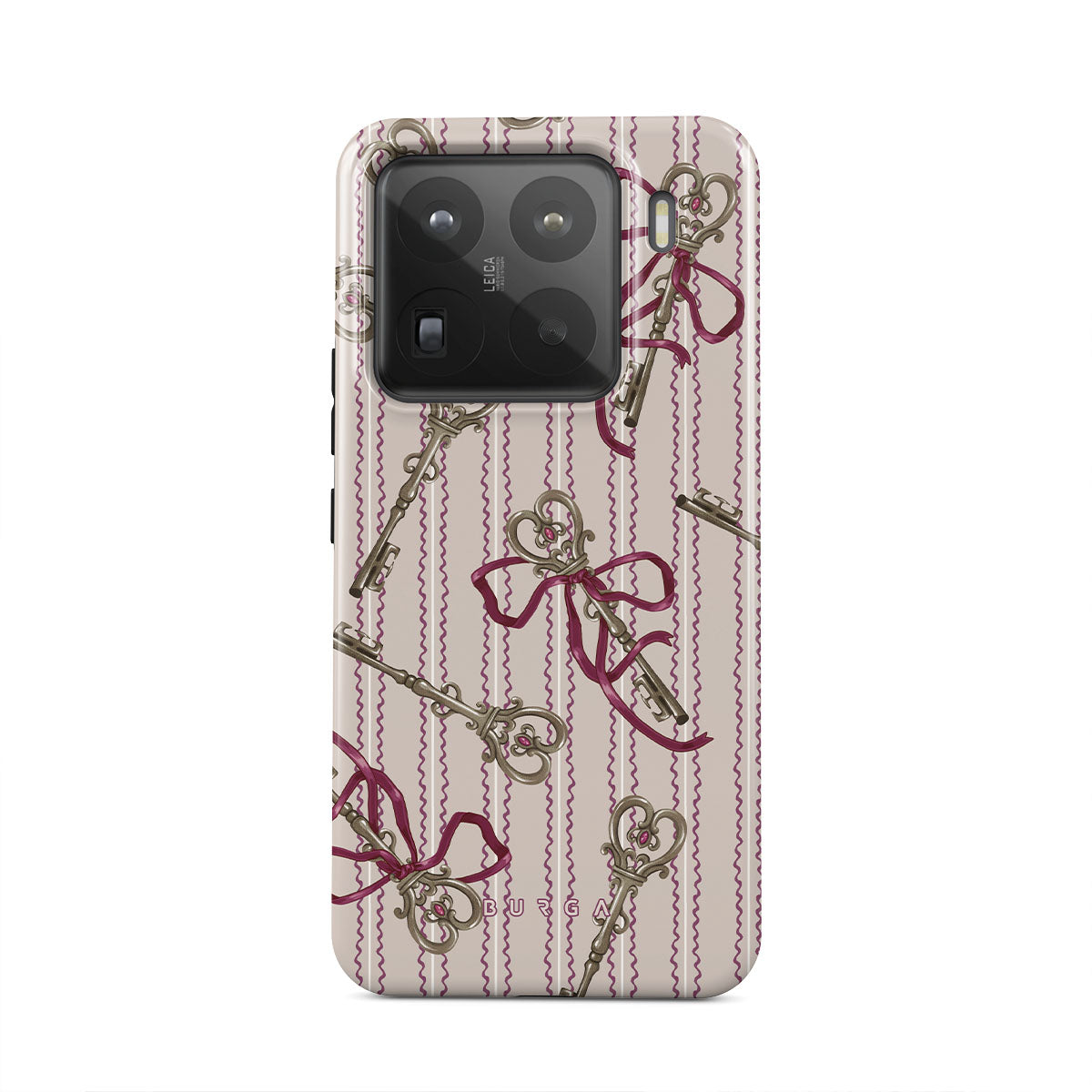 Questo design include: chiavi antiche, fiocchi, nastri rosa, sfondo a righe