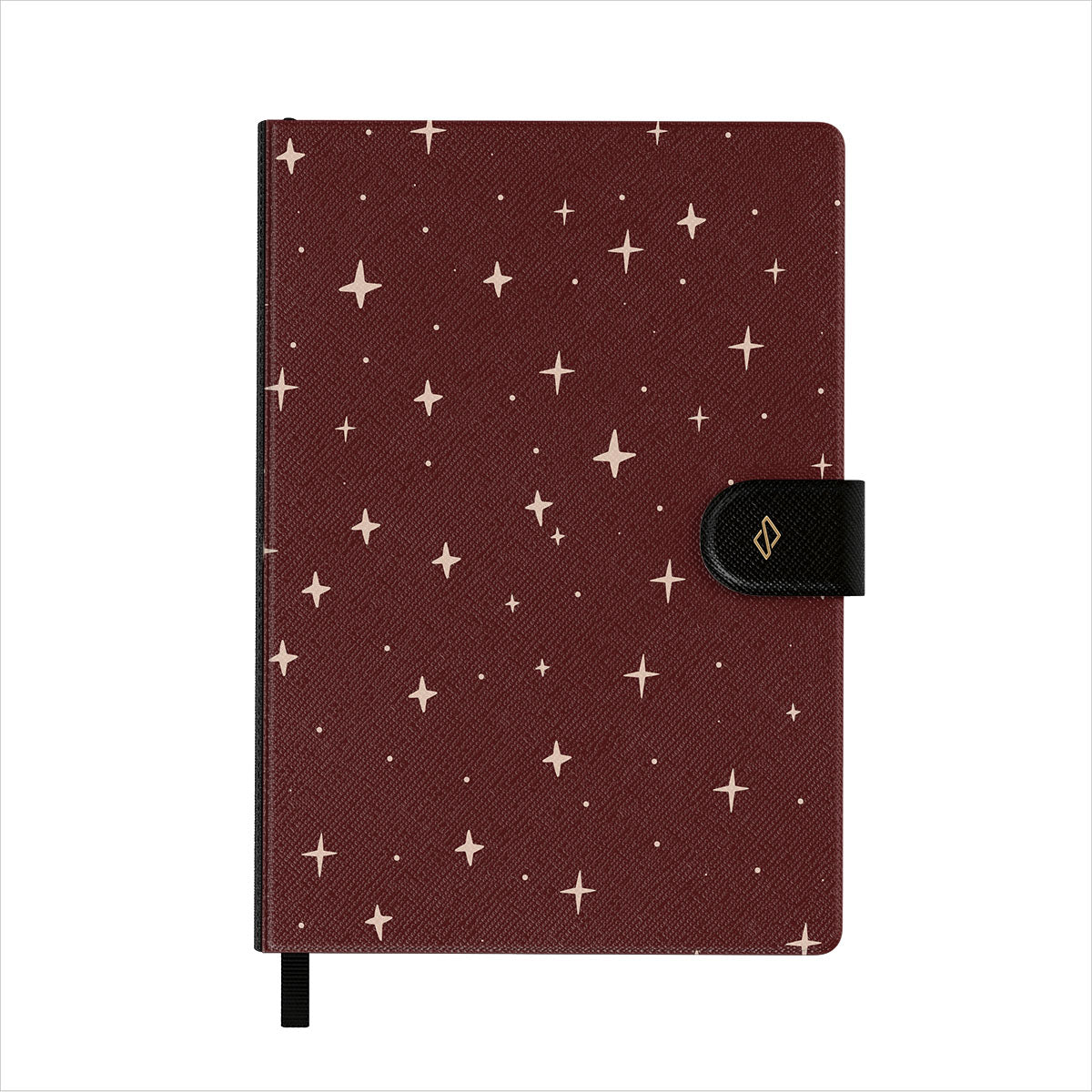 La copertina frontale in ecopelle vegan ha tutte le caratteristiche delle fantasie BURGA: piene di dettagli e di alta qualità. L’elegante segnapagina nero a nastro ti sarà utile per non perdere mai il segno.