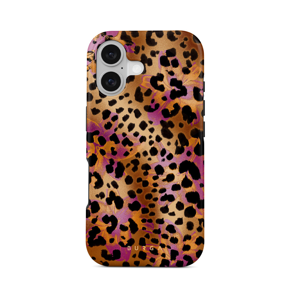 Questo design include: stampa leopardata, marrone, arancione, viola, stampa animale.