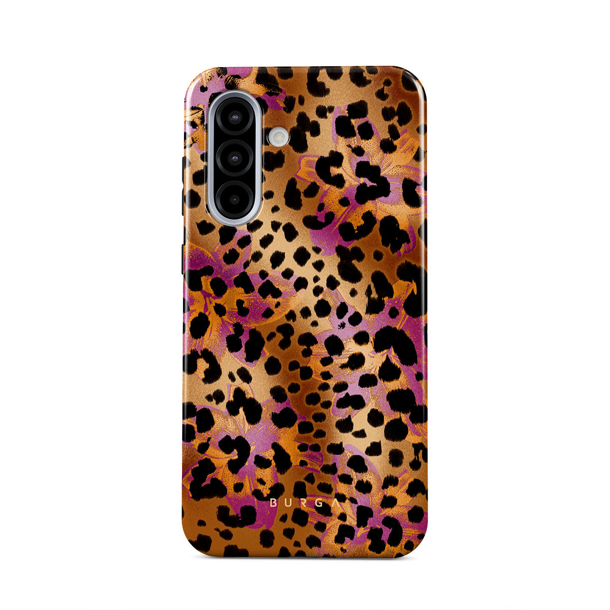 Questo design include: stampa leopardata, marrone, arancione, viola, stampa animale.