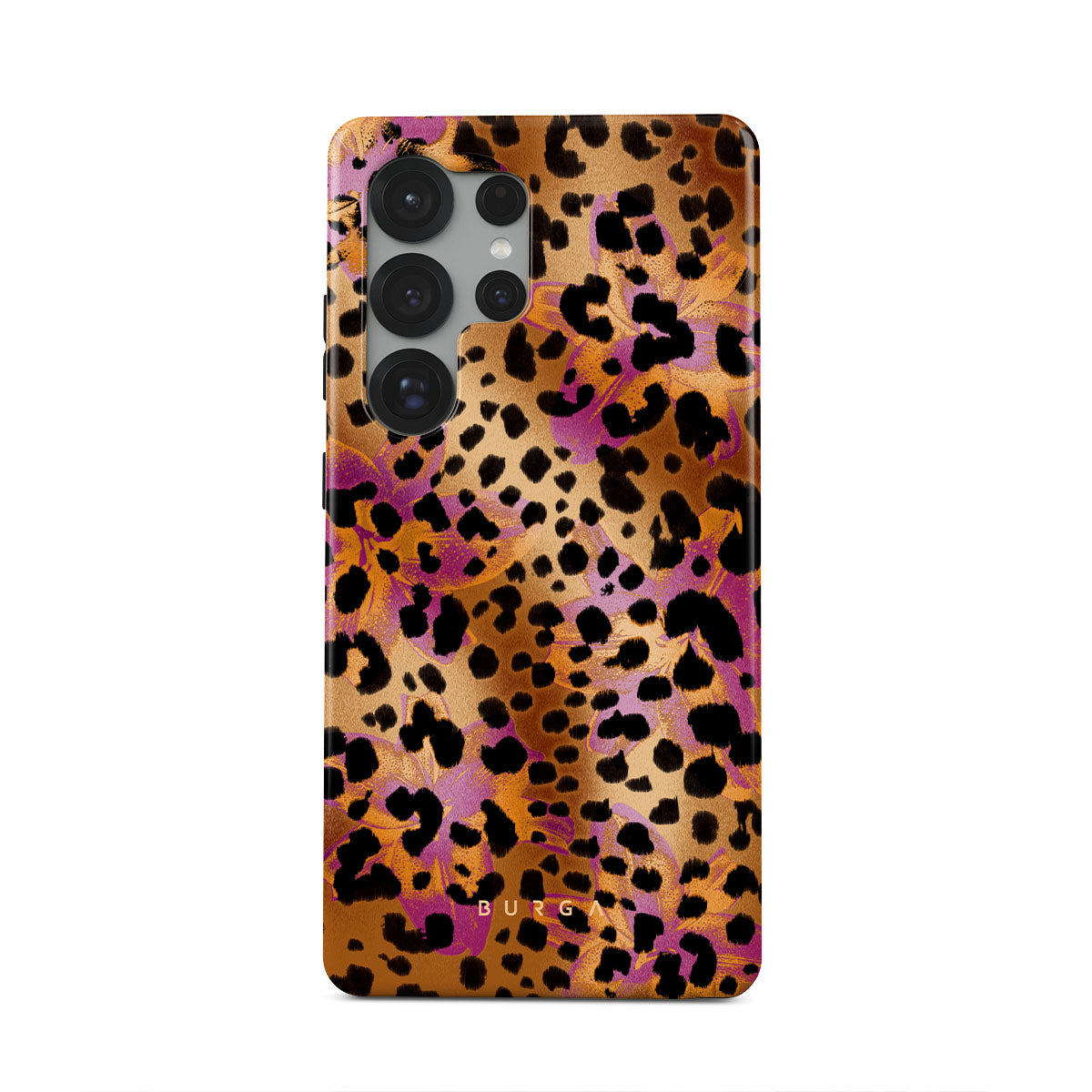 Questo design include: stampa leopardata, marrone, arancione, viola, stampa animale.