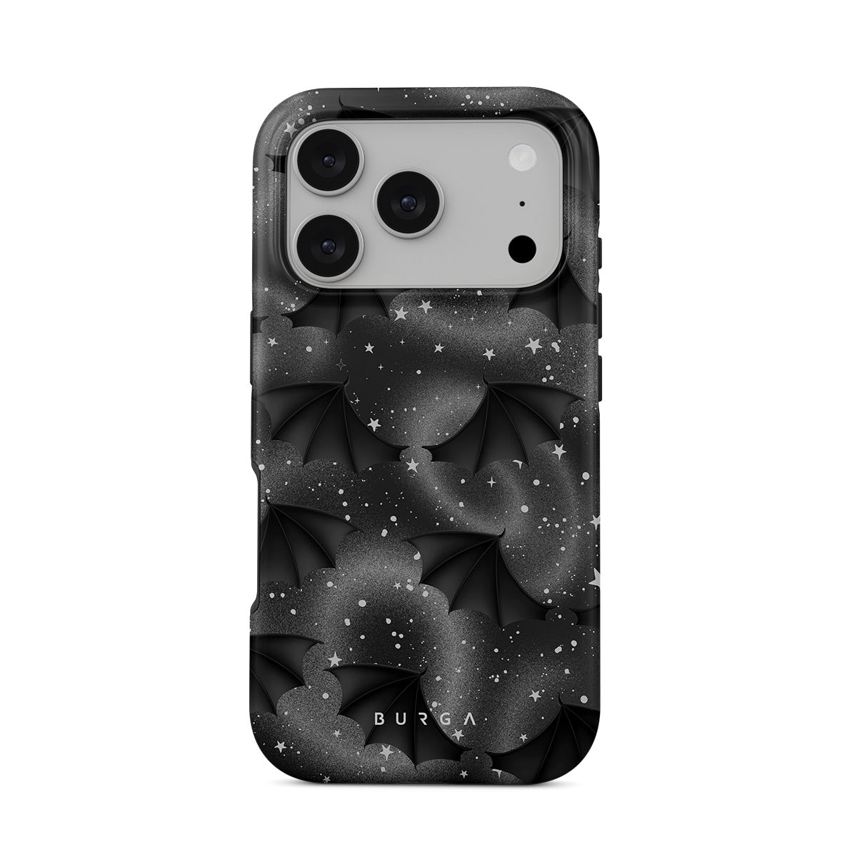Questo design include: ali di pipistrello, stelle, spirali misteriose, cielo nero