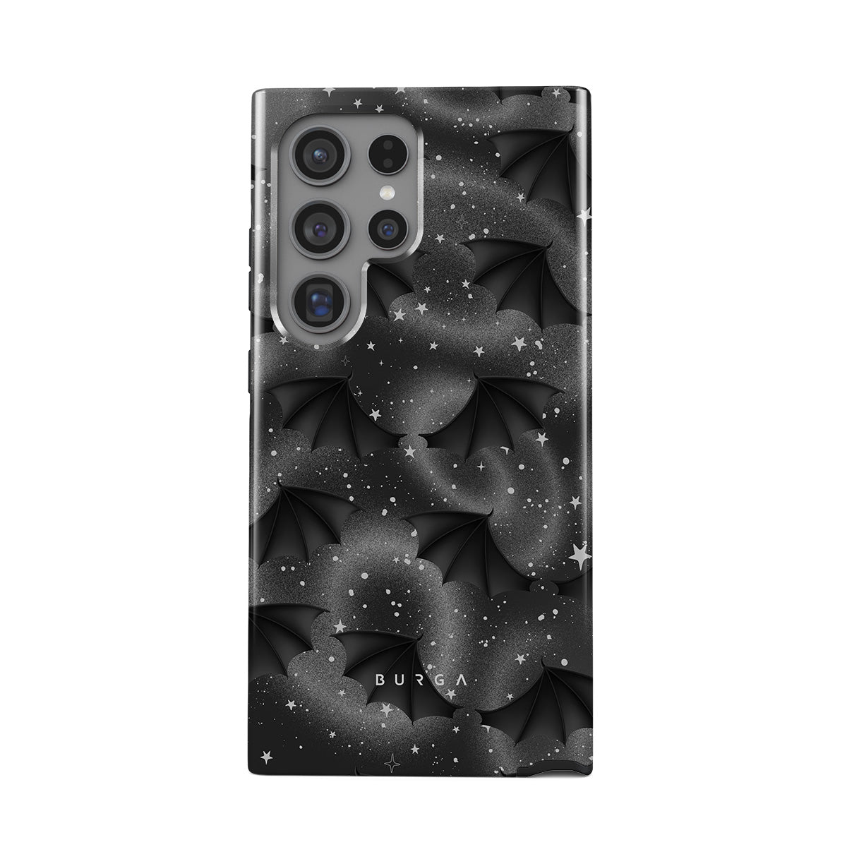Questo design include: ali di pipistrello, stelle, spirali misteriose, cielo nero