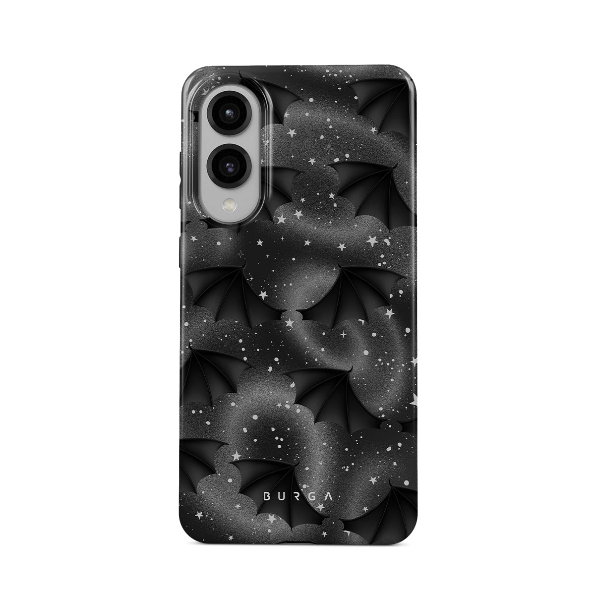 Questo design include: ali di pipistrello, stelle, spirali misteriose, cielo nero