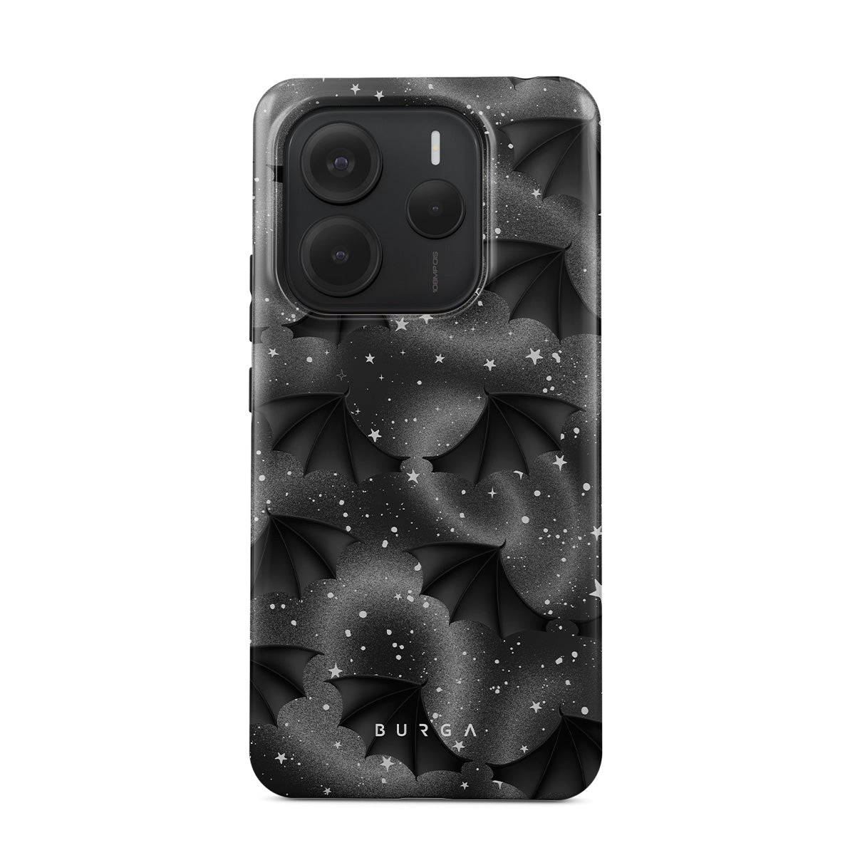 Questo design include: ali di pipistrello, stelle, spirali misteriose, cielo nero