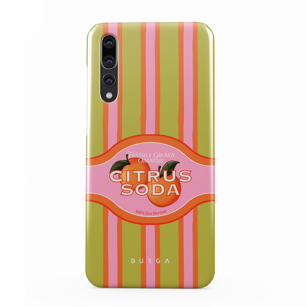 Questo design include: strisce di agrumi vivaci, testo, piante di agrumi, mandarini, pompelmi
