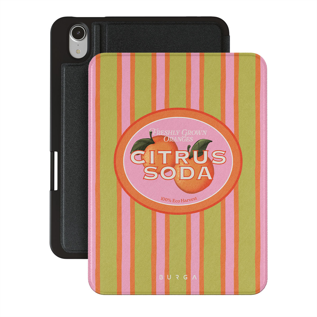 Questo design include: strisce di agrumi vivaci, testo, piante di agrumi, mandarini, pompelmi