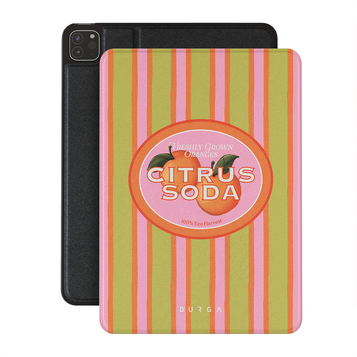 Questo design include: strisce di agrumi vivaci, testo, piante di agrumi, mandarini, pompelmi