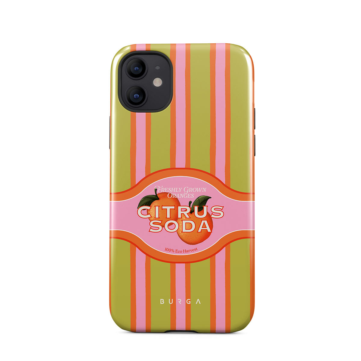 Questo design include: strisce di agrumi vivaci, testo, piante di agrumi, mandarini, pompelmi