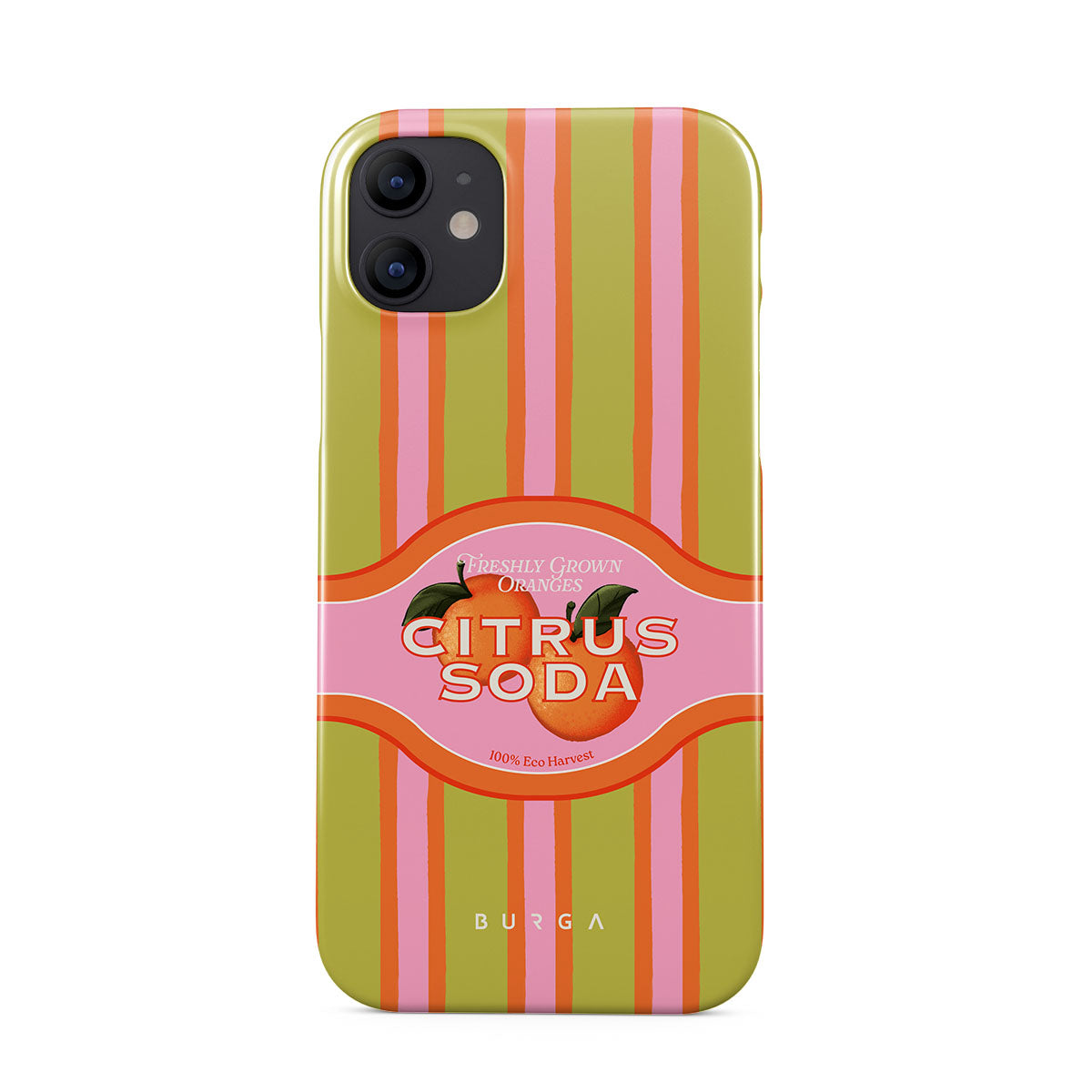 Questo design include: strisce di agrumi vivaci, testo, piante di agrumi, mandarini, pompelmi