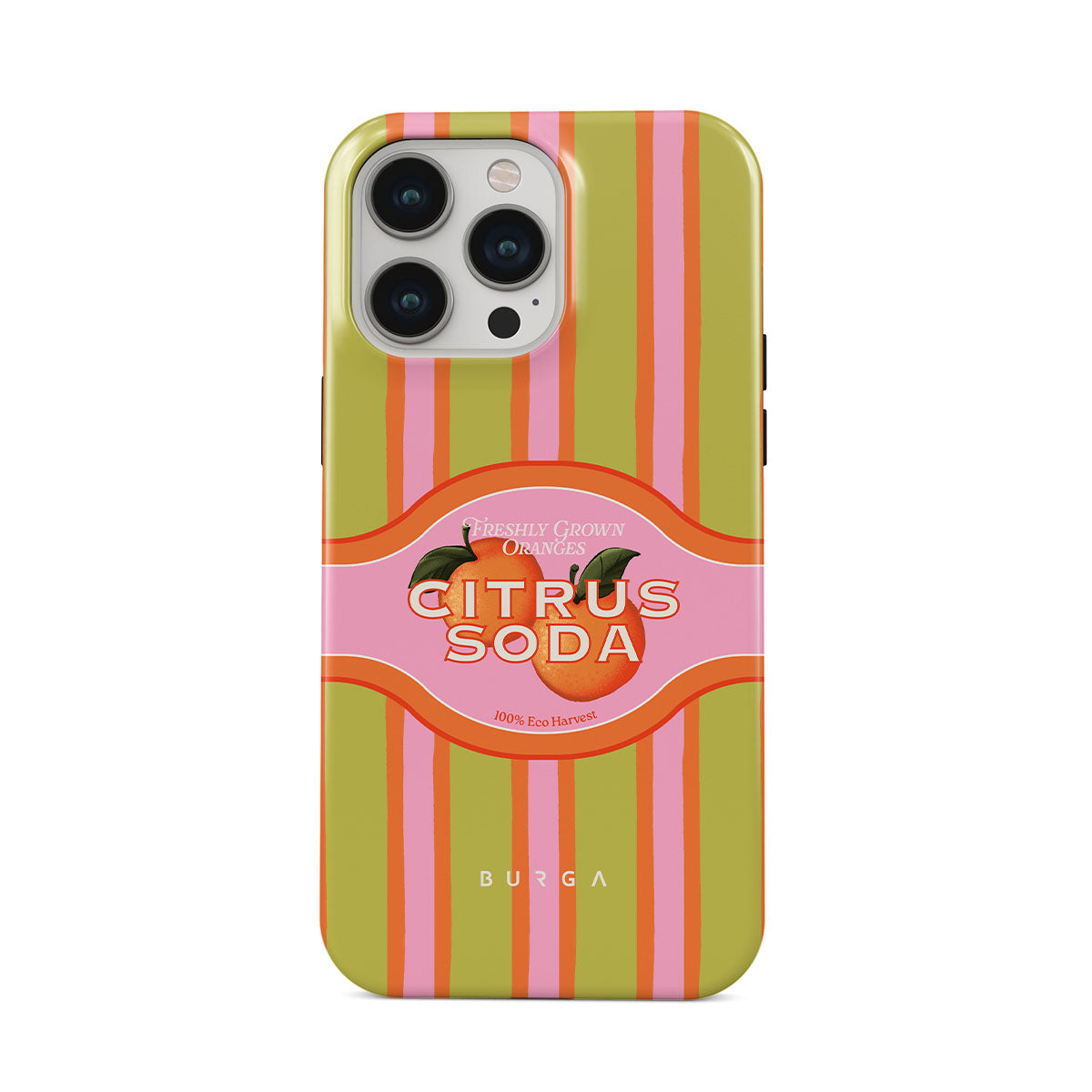 Questo design include: strisce di agrumi vivaci, testo, piante di agrumi, mandarini, pompelmi