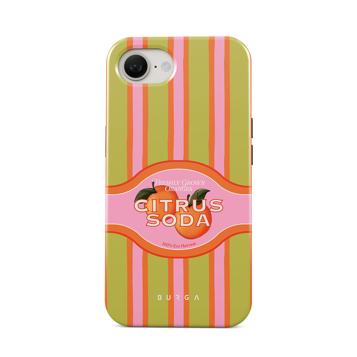Questo design include: strisce di agrumi vivaci, testo, piante di agrumi, mandarini, pompelmi