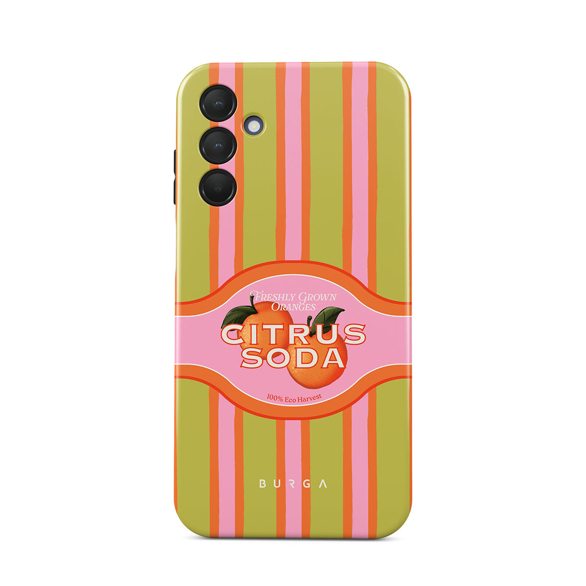 Questo design include: strisce di agrumi vivaci, testo, piante di agrumi, mandarini, pompelmi
