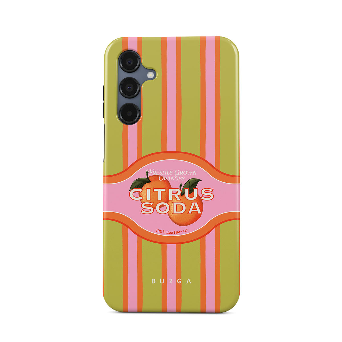 Questo design include: strisce di agrumi vivaci, testo, piante di agrumi, mandarini, pompelmi