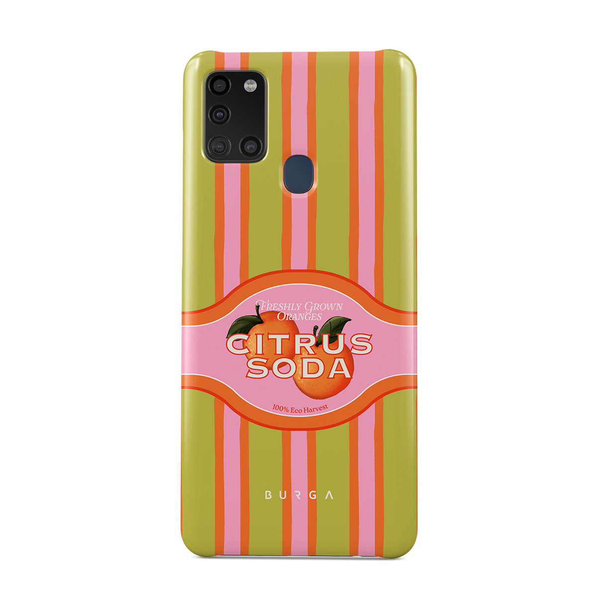 Questo design include: strisce di agrumi vivaci, testo, piante di agrumi, mandarini, pompelmi