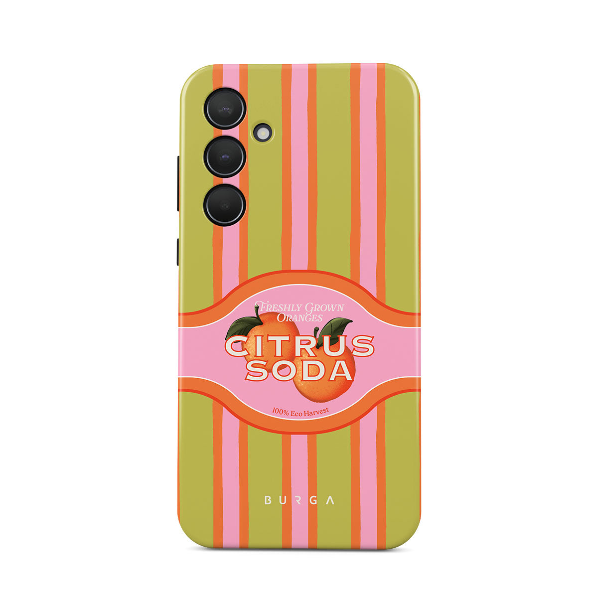 Questo design include: strisce di agrumi vivaci, testo, piante di agrumi, mandarini, pompelmi