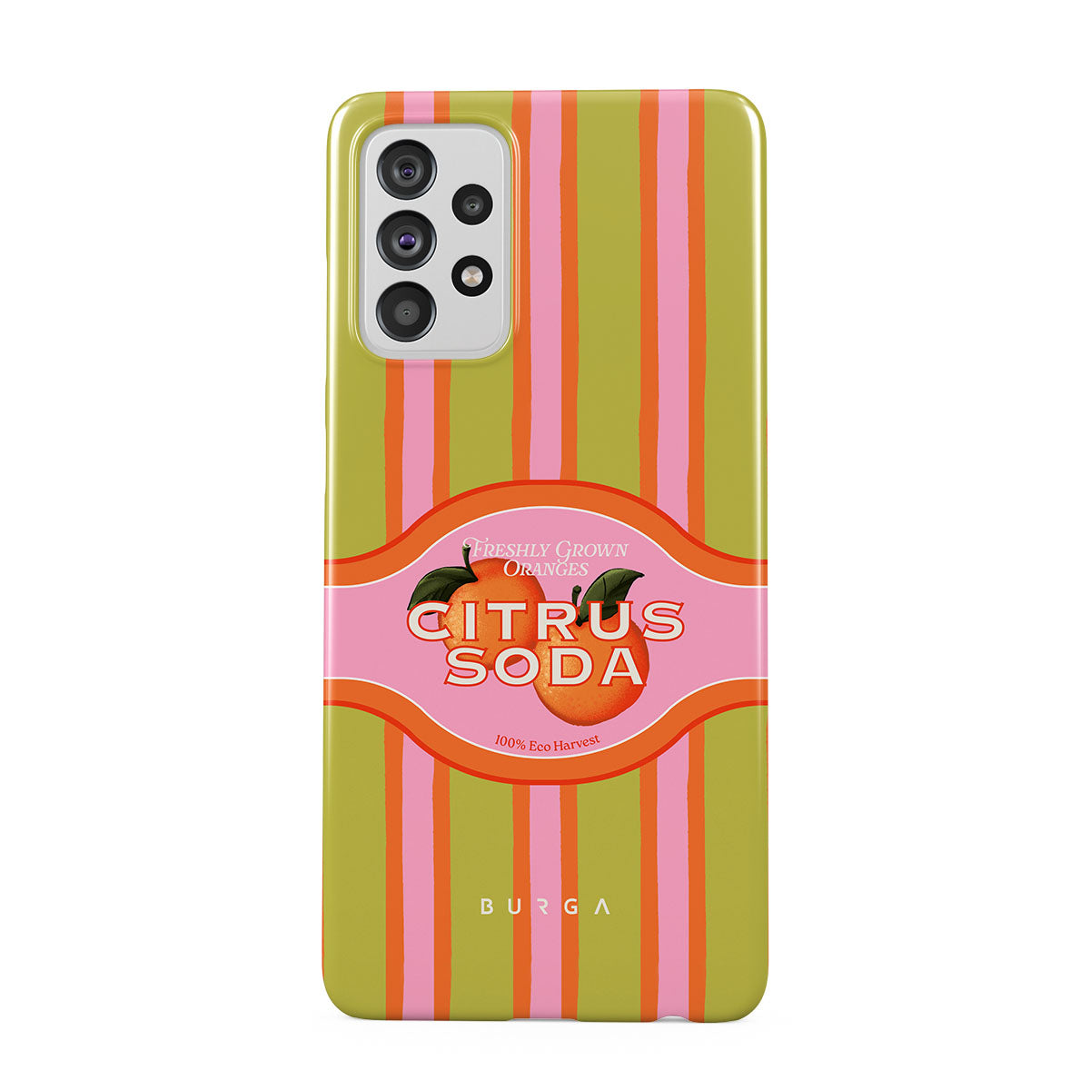 Questo design include: strisce di agrumi vivaci, testo, piante di agrumi, mandarini, pompelmi