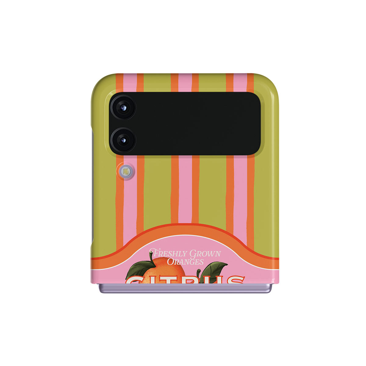 Questo design include: strisce di agrumi vivaci, testo, piante di agrumi, mandarini, pompelmi