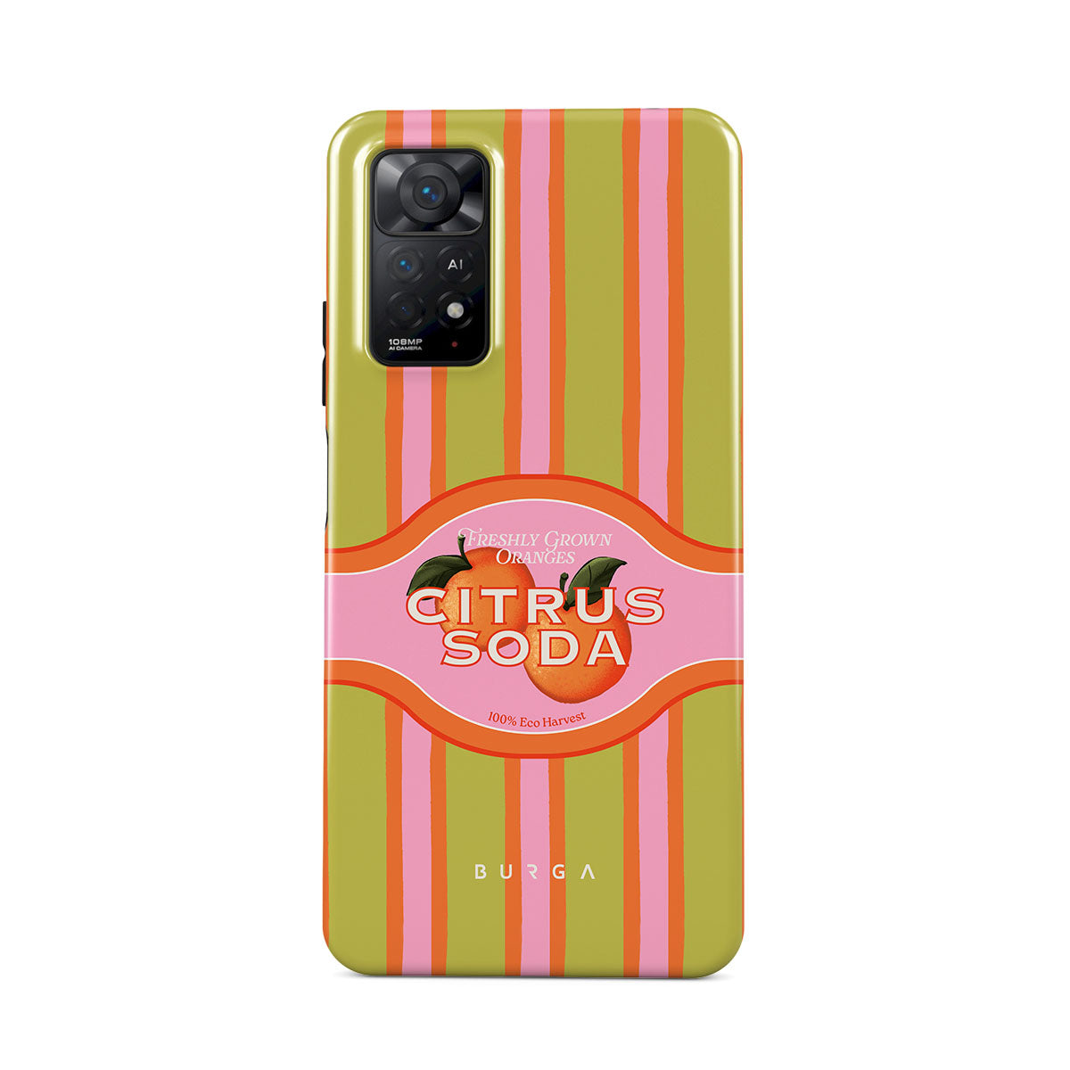Questo design include: strisce di agrumi vivaci, testo, piante di agrumi, mandarini, pompelmi